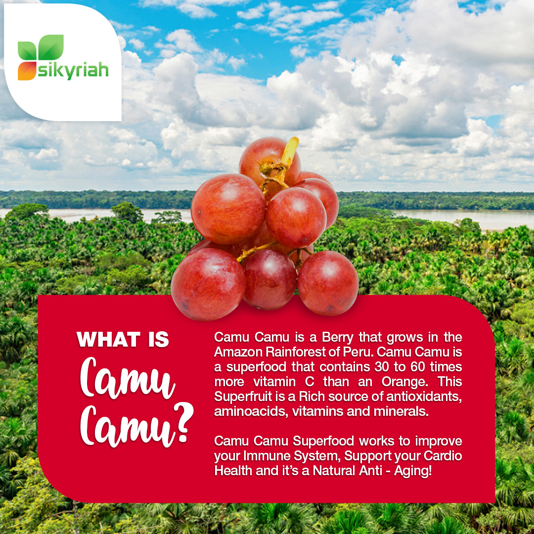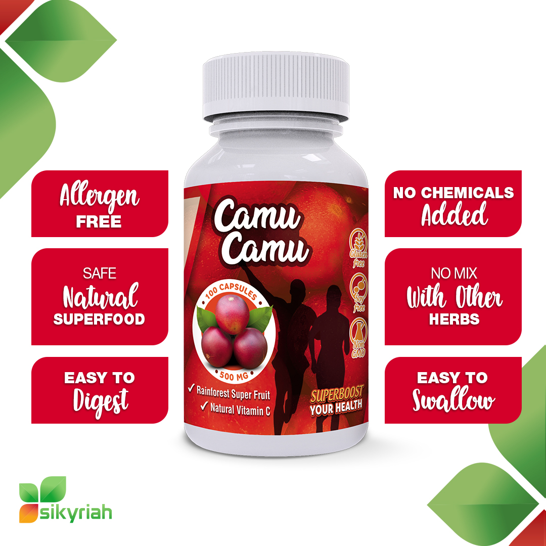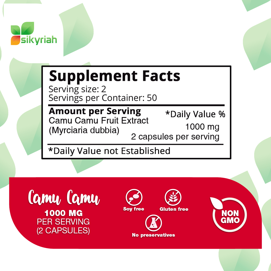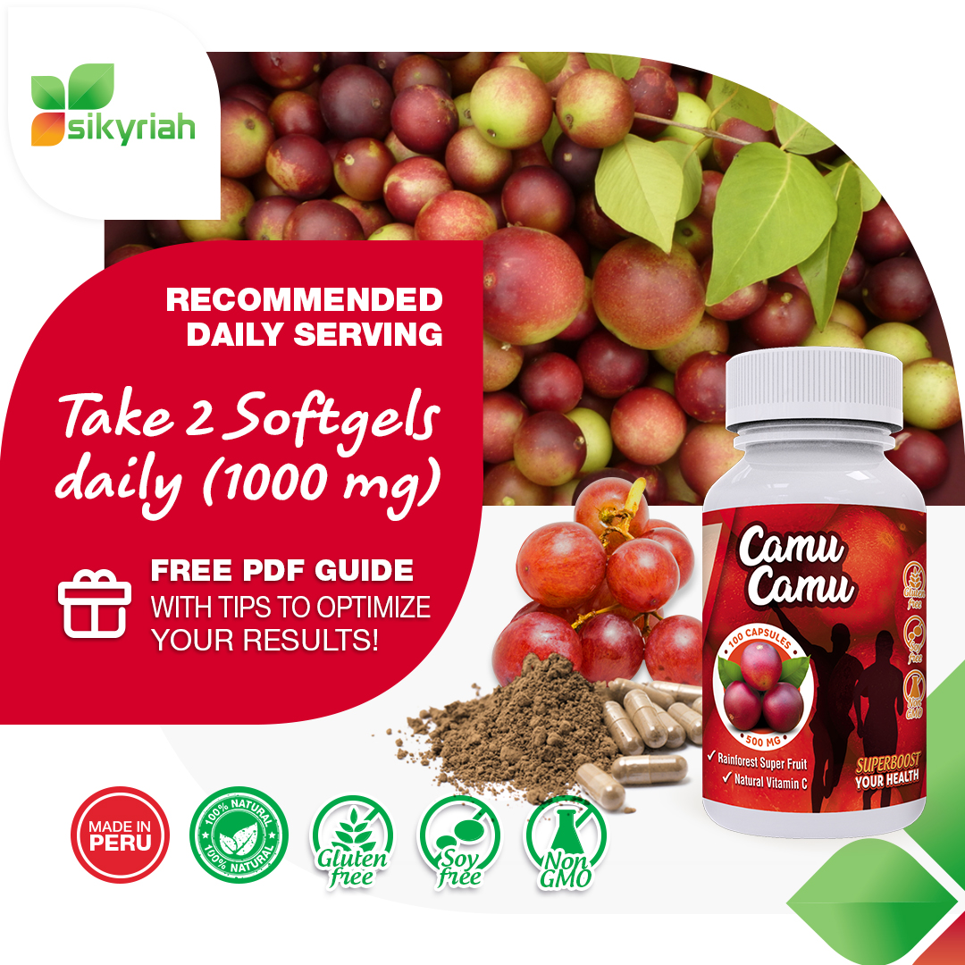 - THE BIGGEST AMOUNT OF VITAMIN C IN CAMU CAMU! -100% pure from Peru. Sikyriah´s Camu Camu Super food contains 1000 mg per serving (2 capsules) to improve your Inmune System.
